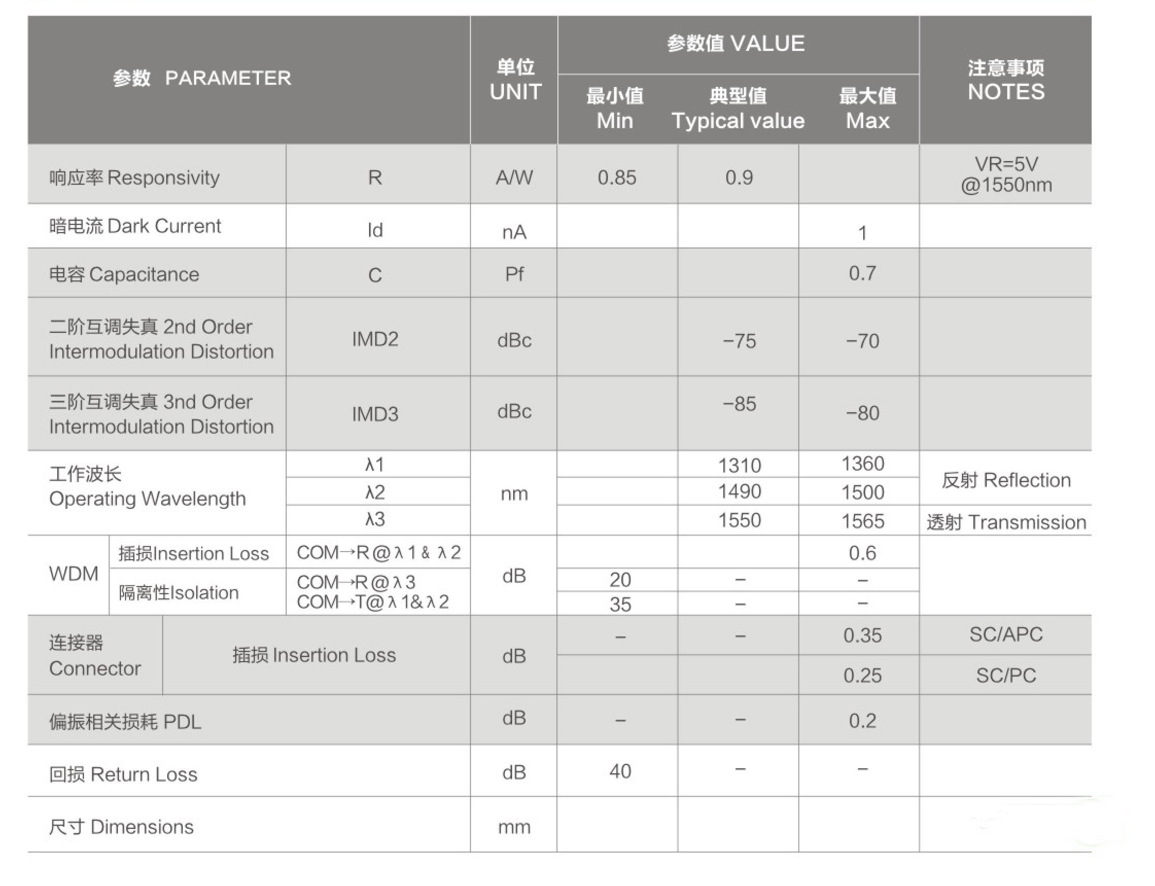 雙芯尾纖式結(jié)構(gòu),實(shí)現(xiàn)1550nm模擬接收,1310nm和1490nm反射進(jìn)入另一根光纖。