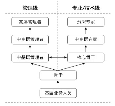 專業(yè)(技術(shù))線:指在某一個或幾個相關(guān)的領(lǐng)域內(nèi),持續(xù)深入的發(fā)展,追求專業(yè)技能的提升,以成為該領(lǐng)域內(nèi)的專業(yè)權(quán)威為目標。