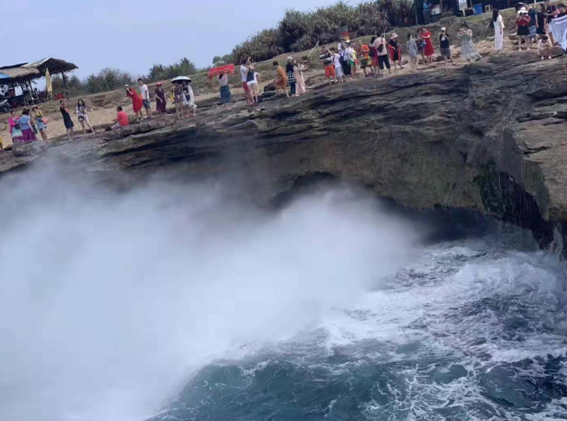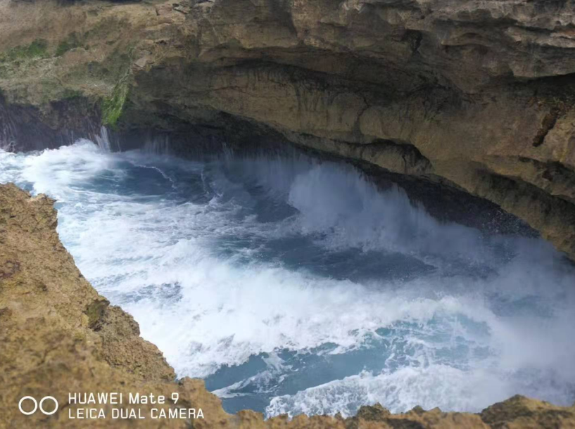 惡魔的眼淚是一個(gè)小的懸崖,但因?yàn)槌D甑暮K疀_刷,形成了一個(gè)開口圓形的形狀。懸崖底端也有被海水沖刷出的洞穴,因?yàn)閴簭?qiáng)的擠壓,漲潮的時(shí)候海浪在這里被沖出幾十米高。我們運(yùn)氣很好看到在陽(yáng)光折射下水霧中的彩虹,而且還拍了不少美麗的照片。