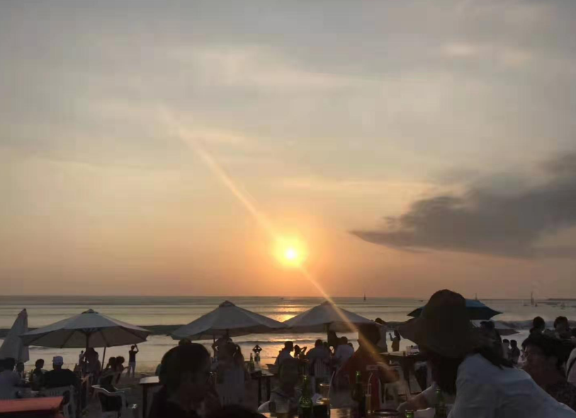 最后一站仍是海邊,而且,是擁有全球十大最美落日之一的金巴蘭海灘。傍晚的金巴蘭,夕陽(yáng)斜斜地掛在海天一線的地方,云層和海水被染得金黃,一層層地變換著顏色,滿目金黃,即使是不太感性的我也為之驚嘆不已。右前方的海灘上,一條機(jī)場(chǎng)跑道筆直延伸入海,銀色的飛機(jī)不斷起降,在斜陽(yáng)的照耀下劃出一道道美麗的弧線。沙灘上,一桌桌的盛宴已經(jīng)一字排開,就等著我們入席了。當(dāng)晚恰逢我們家駒哥哥的生日,同事們紛紛為他送上祝福。燭光搖曳,海風(fēng)輕柔地?fù)崤骖a,靜靜地,看夕陽(yáng)一點(diǎn)點(diǎn)地落入海中,此時(shí)此刻,吃什么已不再重要。難忘的,最是那一抹夕陽(yáng)醉了的溫柔。