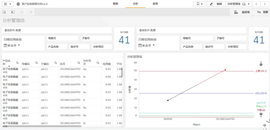 客戶化驗(yàn)數(shù)據(jù)單的結(jié)果,通過BI的方式展現(xiàn)。數(shù)據(jù)的維度是批號,度量是化驗(yàn)項(xiàng)目的檢驗(yàn)值。查詢條件分成兩塊:一是根據(jù)日期范圍、母編號、子編號、產(chǎn)品名稱、批次號、分析項(xiàng)目來檢索數(shù)據(jù);二是根據(jù)日期范圍、母編號、子編號、產(chǎn)品名稱、批次號、分析項(xiàng)目來計(jì)算基準(zhǔn)值(比如UCL、LCL、CL+2σ、CL-2σ等)。整體數(shù)據(jù)展示,增加顯示滿足篩選條件統(tǒng)計(jì)的批次總數(shù);圖表數(shù)據(jù)表格展示(左側(cè)表格);通過UCL、LCL、上限、下限、CL+2σ、CL-2σ、平均、cp、cpk這些基準(zhǔn)值指標(biāo)來分析檢測值展示檢驗(yàn)結(jié)果的圖表(右側(cè)折線圖);增加分析項(xiàng)目檢測值單位顯示(折線圖左側(cè))。