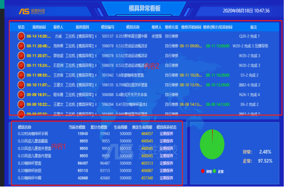 建立模具保養(yǎng)方案,保養(yǎng)計(jì)劃,根據(jù)現(xiàn)場生產(chǎn)實(shí)際情況記錄上模下模記錄,車間可以實(shí)時(shí)查看模具相關(guān)報(bào)表。